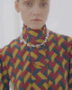 Bluse mit glatter Vorderseite und verdeckter Knopfleiste, die eine klare und feminine Linie schenkt. Der Rücken ist mit eingesetzten Falten am Armloch und einem kontrastfarbenen Innenkragen mit Größenstickerei veredelt – ein einzigartiges, maßgeschneidertes Detail. Die langen Ärmel mit Rüschen an Schulter und Saum verleihen Volumen und Bewegung und betonen die Silhouette. Die rechteckige Manschette mit Ein-Knopf-Verschluss greift den klassischen Stil auf, während der Kragen mit doppelt gelegtem Schal und mittigem Rückenausschnitt ein markantes und vielseitiges Detail bietet, das auf verschiedene Arten gebunden werden kann. Der abgerundete Saum komplettiert das Design. Hergestellt aus reiner Seide mit exklusiv für Le Sarte Pettegole angefertigtem geometrischem Print in Ocker- und Bordeauxtönen. Perfekt kombiniert mit dem Rock im gleichen Muster für einen kompletten Le Sarte Pettegole Look.