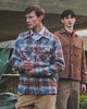 Over fit shirt-jacket with structured finishes and a laid-back style. Featuring a classic pointed collar, this shirt is crafted from pure cotton washed flannel in brown and light blue checks. The front fastening with five horizontal buttons is paired with double rounded flap pockets on the chest and side welt pockets. On the back, the topstitched yoke with two pleats adds volume, while the rounded cuffs with a single pleat complete the design with a tailored touch.